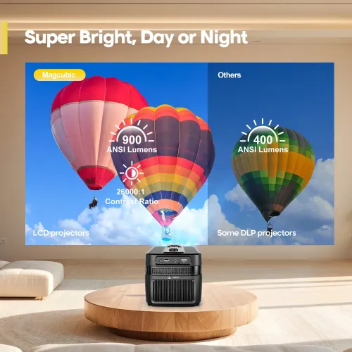The Magcubic HY450C 900 ANSI Android 11 Ultra Short Throw Projector has a native Full HD 1920×1080p resolution and supports 4K decoding, providing fine details and clarity for movies, presentations, and games. With a remarkable brightness of 900 ANSI lumens and a contrast ratio of 26000:1, the Magcubic HY450C Projector offers rich colors, deeper blacks, and clear pictures even in brighter settings. The Magcubic Ultra Short Throw Projector, with its ultra short throw capability and innovative auto offset design, can project enormous pictures from short distances, making it suitable for small rooms and limited places. The Magcubic HY450C Android Projector, powered by an Allwinner H713 processor and running Android 11, provides direct access to popular streaming apps, smooth navigation, and dependable performance, thanks to 2GB RAM and 16GB ROM. WiFi 6 ensures quick and stable streaming, while Bluetooth 5.4 allows for easy connecting with speakers, headphones, or controllers. Audio output is handled by two built-in 5W HiFi speakers that provide balanced and clear sound for everyday viewing. The Magcubic HY450C Android Projector has user-friendly features including auto focus and vertical auto keystone correction, which enable quick setup and accurate image alignment. Micro-adjustment nuts allow you to fine-tune viewing angles, and four bottom screw mounting holes ensure a stable installation. A built-in carrying handle enhances portability, making the Magcubic HY450C 900 ANSI Android 11 Ultra Short Throw Projector simple to transport between rooms or locations.