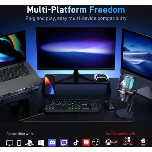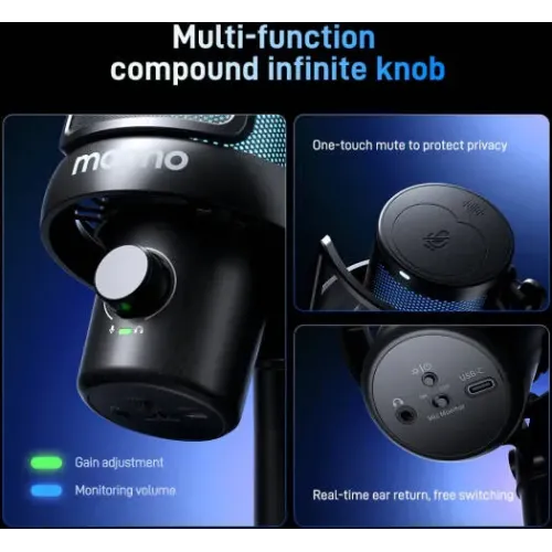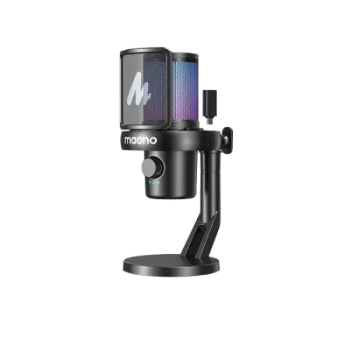 The Maono DM40 Pro is a feature-rich desktop microphone designed for gamers, streamers, podcasters, and content creators who demand both style and substance. This sleek black mic delivers broadcast-quality sound with rich detail and immersive clarity, ideal for professional-grade voiceovers, live streams, and online meetings. Its standout feature—AI Voice Change with 10 dynamic effects—lets you transform your voice into game characters, superheroes, and more (PC only via Maono Link), adding a playful, personalized twist to your content. Enjoy instant wireless freedom with up to 75 hours of battery life, or switch to USB/USB-C plug-and-play for seamless compatibility across PCs, laptops, smartphones, and Macs. Whether you're in a quiet studio or a noisy gaming room, the four adjustable noise reduction levels (Low, Medium, High, and Custom) ensure your voice cuts through with crystal clarity. The intuitive Maono Link app gives you full control over EQ settings, voice effects, volume, and the stunning 16M+ RGB lighting customization, allowing you to match your mic to your mood or gaming setup . Designed for creators who value ease and precision, the Maono DM40 Pro includes one-touch mute, gain control, and zero-latency monitoring, so you can fine-tune your sound in real time without missing a beat. Whether you're building a personal brand, hosting a podcast, or leveling up your gaming experience, the Maono DM40 Pro combines smart technology with expressive design—making it more than just a microphone.