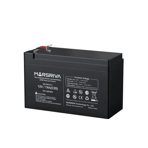 The Marsriva MR-PBU12-7 12V 7Ah Sealed Lead-acid Battery is a premium-quality, maintenance-free AGM (Absorbent Glass Mat) battery designed to deliver long-lasting and dependable backup power for a wide range of applications. Featuring a nominal voltage of 12V and a capacity of 7.0Ah, this high-performance battery is ideal for use in UPS systems, emergency lighting, alarm and security systems, medical devices, and solar-powered equipment. The Marsriva MR-PBU12-7 12V 7Ah Battery is engineered with precision sealing technology and a valve-regulated design, ensuring leak-proof operation and maximum safety even under demanding conditions. Built with a Pb-Ca multi-alloy grid, it offers high corrosion resistance, longer service life, and better conductivity. Its maximum discharge current of 105A for 5 seconds allows it to handle high-energy demands with ease, making it suitable for instant power surge requirements. The battery has an internal resistance of approximately 42.0mΩ, contributing to efficient power output and minimal energy loss. With a low self-discharge rate of only 3% per month at 25℃, the Marsriva MR-PBU12-7 12V 7Ah UPS Battery retains charge over extended periods of storage. It supports float charging voltages between 13.5V to 13.8V and cycle use voltages ranging from 14.4V to 15V at 25℃, ensuring optimal charging performance in both standby and cyclic applications. The Marsriva MR-PBU12-7 12V Battery is housed in a durable ABS casing that is both heat and impact-resistant, and it weighs just 2.0kg, making it easy to install and maintain. Equipped with F1/F2 terminal options, this battery ensures flexible connectivity for various systems. Thanks to its high energy density, powerful discharge capability, excellent charge acceptance, and deep cycle performance, the Marsriva MR-PBU12-7 12V 7Ah Sealed Lead-acid Battery stands out as a top-tier solution for anyone needing reliable backup power with consistent performance and long service life.