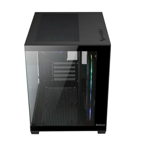 The MaxGreen DarkWave F5 Mid-Tower M-ATX Gaming Case is a premium choice for gamers and PC enthusiasts seeking a balance of performance, airflow, and modern aesthetics. Designed with a durable combination of tempered glass and metal, this sleek black chassis supports M-ATX motherboards and showcases your build through its transparent left-side panel, while the solid right panel ensures strength and clean cable management. Pre-installed with five ARGB fans two 120mm fans on the top, two 120mm reverse blade fans on the motherboard shroud, and one 120mm rear fan the DarkWave F5 delivers optimized cooling and customizable lighting effects that sync seamlessly with your motherboard. For advanced thermal solutions, it accommodates a 240mm water radiator at the top and offers multiple mounting options for additional fans at the top, bottom, rear, and side. Connectivity is streamlined with a front I/O panel featuring USB 3.0, dual USB 1.1 ports, and HD Audio & Mic support, while storage needs are met with one 3.5” HDD bay, three 2.5” SSD bays, and five expansion slots for versatile upgrades. Compact yet spacious, the case measures providing clearance for GPUs up to 330mm and CPU coolers up to 160mm. A magnetic dust filter on the top ensures easy maintenance and cleaner internals. With no built-in PSU, users have the flexibility to choose their preferred power supply, making the MaxGreen DarkWave F5 a stylish, functional, and airflow-focused gaming case ideal for building powerful compact rigs.