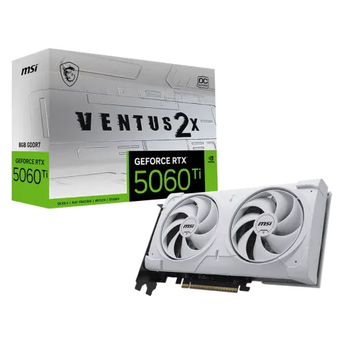 The MSI GeForce RTX 5060 Ti 8G VENTUS 2X OC WHITE PLUS 8GB GDDR7 Graphics Card delivers next-generation performance powered by NVIDIA Blackwell architecture and advanced DLSS 4 technology. Designed for gamers and creators, the MSI Graphics Card ensures smooth gameplay and accelerated AI-driven rendering. The MSI GeForce RTX 5060 Ti 8G VENTUS 2X OC WHITE PLUS GPU features 4608 CUDA cores for powerful parallel processing and enhanced visual computing. Extreme Performance clock reaches 2617 MHz via MSI Center, while the boost clock operates at 2602 MHz for stable overclocked results. With 8GB GDDR7 memory running at 28 Gbps and a 128-bit memory bus, this MSI RTX 5060 Ti Graphics Card delivers fast bandwidth. The PCI Express Gen 5 x16 interface, operating at x8, ensures reliable compatibility with modern motherboards and high-speed data transfer. STORMFORCE FAN technology uses seven fan blades, claw texturing, and circular arcs to maximize airflow while minimizing operational noise. Precision-engineered heat pipes efficiently transfer thermal energy away from the GPU core, improving sustained cooling performance during intensive workloads. A reinforcing backplate with airflow vents allows direct exhaust passage, strengthening structure and maintaining optimal thermal management. The MSI GeForce RTX 5060 Ti 8G VENTUS 2X OC WHITE PLUS Graphics Card supports DirectX 12 Ultimate and OpenGL 4.6 for advanced graphical features and broad software compatibility. Connectivity includes three DisplayPort 2.1b outputs and one HDMI 2.1b port supporting up to 4K 480Hz or 8K 120Hz with DSC, VRR, and HDR. HDCP support ensures secure content playback, while G-SYNC technology eliminates screen tearing for fluid visuals. With 180W power consumption, a single 8-pin connector, and a recommended 600W PSU, installation remains straightforward. The MSI GeForce RTX 5060 Ti 8G VENTUS 2X OC WHITE PLUS 8GB GDDR7 Graphics Card supports up to four displays and delivers a maximum digital resolution of 7680 x 4320 for immersive experiences.