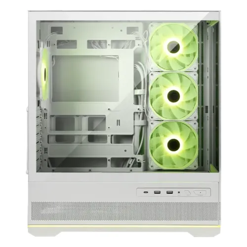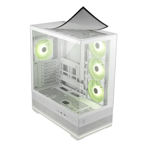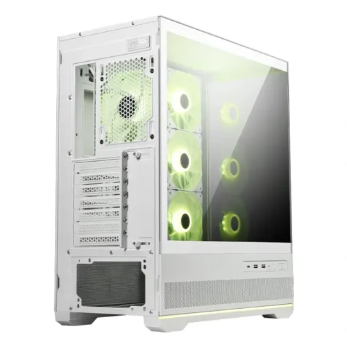 The MSI MAG PANO 110R PZ WHITE ARGB ATX mid-tower gaming casing is designed with style, airflow, and flexibility in one package. Its 270-degree panoramic tempered glass construction provides a clear view of your hardware, making it excellent for exhibiting high-end components and lighting configurations. This case takes a wide range of motherboards, including normal ATX, Micro-ATX, Mini-ITX, and back-connect ATX or Micro-ATX, giving consumers the ability to customize their system. The MSI MAG PANO 110R PZ WHITE Gaming Case has three reverse blade ARGB fans on the sides and one in the back for maximum airflow and lighting effects without fan frames. The built-in 1-to-5 ARGB fan control board supports up to five fans and lets you choose from 18 different lighting effects with a single LED button, making customization simple and accessible. The MSI MAG PANO 110R PZ WHITE Gaming Casing's cooling performance is a standout feature, with support for up to 10 fans, a 360mm radiator on top and a 120mm radiator on the back, and a bottom chamber with vented panels that enhances airflow to maintain stable system performance. The MSI Gaming Casing can accommodate GPUs up to 400mm long, CPU coolers up to 160mm, and PSUs up to 200mm, leaving plenty of room for high-performance projects. The MSI MAG PANO 110R PZ WHITE ARGB Gaming Casing has two 2.5-inch bays, two 3.5-inch bays, and two combo slots that accept 2.5- or 3.5-inch drives. The seven expansion slots provide multi-GPU or additional card setups. The front I/O panel includes one USB 20Gbps Type-C and two USB 5Gbps Type-A connections, as well as audio-out/mic-in plugs, an LED control button, and a power button.