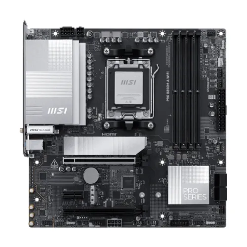 The MSI PRO B850M-A WIFI AM5 mATX Motherboard is a powerful and feature-rich solution that supports AMD Ryzen 9000, 8000, and 7000 desktop processors. This motherboard, built for stability, performance, and future-ready connectivity. With the AMD B850 chipset, this MSI motherboard delivers high-speed performance with features packed into an efficient micro-ATX form factor (243.84mm x 243.84mm).For superior memory support, the PRO B850M-A WIFI features 4x DDR5 UDIMM slots that can handle up to 256GB of high-speed RAM. It supports DDR5 speeds from 4800 MT/s (JEDEC) up to an impressive 8200+ MT/s (OC), with full compatibility for AMD EXPO technology, dual-channel architecture, and clock driver bypass mode. Whether you're overclocking for speed or running stable stock settings, this MSI PRO B850M-A WIFI ensures smooth and responsive performance.In terms of graphics and display capabilities, this is equipped with 1x HDMI 2.1 and 1x DisplayPort 1.4, both supporting up to 4K resolution at 60Hz — ideal for users running APUs with integrated graphics. Expansion is handled via 3 PCIe slots, including PCIe 5.0 x16 for GPUs (Ryzen 9000/7000), PCIe 4.0 x4, and PCIe 3.0 x1, ensuring flexible upgrade paths for graphics cards and other PCIe devices.For ultra-fast storage, the MSI PRO B850M-A WIFI Motherboard includes 2x M.2 slots with advanced PCIe lanes. The M2_1 slot supports PCIe 5.0 x4 with Ryzen 9000/7000 and PCIe 4.0 x4 with Ryzen 8000, while the M2_2 slot supports PCIe 4.0 x4 or x2, depending on CPU model. Also, 4x SATA 6Gb/s ports provide support for traditional SSDs or HDDs with RAID 0, 1, and 10 configurations. NVMe drives in M.2 slots also support RAID 0 and 1, enhancing storage flexibility and speed.On the networking front, the MSI B850M-A WIFI features Realtek 8126VB 5G LAN for ultra-fast wired internet and a built-in Wi-Fi 7 module, supporting dual-band (2.4GHz/5GHz/6GHz), MU-MIMO, and Bluetooth 5.4 — perfect for lag-free online gaming, wireless peripherals, and seamless streaming. Future-proof wireless support is ensured with Windows 11 24H2 readiness for full Wi-Fi 7 and Bluetooth 5.4 functionality.For audio, the PRO B850M-A WIFI Motherboard integrates Realtek ALC897 7.1-channel high-definition audio, delivering rich, immersive sound for gamers and media users. Internal headers and connectors include multiple USB options (including USB 10Gbps Type-C and Type-A), addressable RGB headers, TPM 2.0 support, and EZ Debug LEDs for quick troubleshooting.With robust build quality, modern connectivity, and high-speed memory and storage support, the MSI PRO B850M-A WIFI AM5 motherboard is an exceptional choice for users looking to build a reliable and performance-driven PC using the latest AMD technologies.