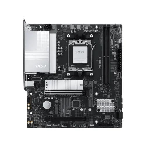 The MSI PRO B850M-G Motherboard is a powerful, feature-rich board that is ideal for professionals, gamers, and PC builders looking for great performance and dependability. The MSI PRO B850M-G AM5 Motherboard, based on the AMD B850 chipset, supports the latest AMD Ryzen 9000, 8000, and 7000 Series Desktop Processors on the AM5 socket, ensuring top-tier compatibility and future-proof performance. This MSI PRO B850M-G AM5 ATX Motherboard (mATX form factor, 226 x 243.84mm) delivers excellent power efficiency and expansion potential in a compact size. It includes two DDR5 UDIMM slots supporting up to 128GB of dual-channel memory, with speeds reaching 8200+ MT/s (OC) for Ryzen 9000 Series processors—ideal for gaming, content creation, and multitasking. For graphics, the MSI PRO B850M-G features 1x HDMI 2.1 and 1x DisplayPort 1.4, both supporting 4K @ 60Hz, ensuring stunning visuals and crystal-clear display output. It provides ultra-fast storage with 2x M.2 slots (one supporting PCIe 5.0 x4) and 4x SATA 6Gb/s ports, along with support for RAID 0, 1, and 10 configurations. The motherboard also includes Realtek 8126VB 5G LAN for lightning-fast internet speeds and a wide array of USB options, including USB 10Gbps Type-C, USB 5Gbps Type-A, and USB 2.0 ports for enhanced connectivity. Expansion capabilities are powered by two PCIe x16 slots, where the primary slot supports PCIe 5.0 x16 for advanced GPUs, ensuring maximum gaming and rendering performance. Audio quality is powered by the Realtek ALC897 7.1-Channel HD Audio Codec, delivering immersive, studio-grade sound. Other standout features include EZ Debug LEDs, EZ Memory Detection LED, Flash BIOS Button, and multiple ARGB V2 and RGB headers for easy setup, troubleshooting, and aesthetic customization. With its premium build, high-speed performance, and future-ready AM5 platform, the MSI PRO B850M-G AM5 Motherboard stands as a reliable, compact, and powerful choice for modern PC builds.