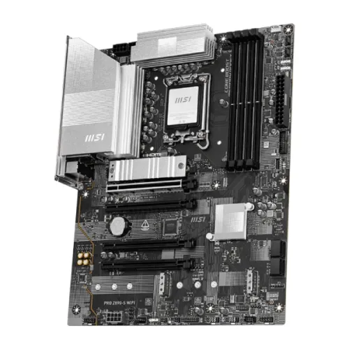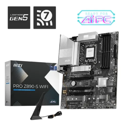 The MSI PRO Z890-S WIFI LGA 1851 ATX motherboard is a powerhouse that supports Intel Core Ultra Processors (Series 2) and has an LGA 1851 socket, providing great performance and durability. This MSI Z890 Motherboard supports DDR5 memory with dual-channel architecture, allowing speeds of up to 8800+ MT/s (OC) and a maximum capacity of 256GB. With a 6-layer server-grade PCB, dual 8-pin CPU power connectors, and a sturdy 12+1+1+1 Duet Rail Power System, it guarantees excellent power supply and stability for high-performance systems. Thermal efficiency is improved by cooling solutions such as the M.2 Shield Frozr, 7W/mK MOSFET thermal pads, and expanded heatsink. Installation is made easy and convenient by EZ DIY features like EZ M.2 Clip II, EZ PCIe Clip II, and EZ Antenna. The MSI PRO Z890-S WIFI motherboard features cutting-edge connectivity with PCIe 5.0 slots, Lightning Gen 5 x4 M.2, and a Thunderbolt 4 connection supporting 40Gbps transfer speeds, 8K displays, and USB 4.0 compatibility. In addition, this MSI Intel Ultra Series Motherboard has Bluetooth 5.4 for smooth device integration, 2.5G LAN, and Intel Wi-Fi 7 for quick, safe, and reliable networking. The Realtek ALC897 Codec-powered Audio Boost technology guarantees rich audio for multimedia and gaming. The MSI PRO Z890-S WiFi LGA1851 Motherboard Storage options are diverse and flexible, with support for up to three M.2 slots, four SATA 6G connections, and RAID configurations. Onboard graphics include HDMI 2.1, DisplayPort 1.4, and a Type-C DisplayPort that supports resolutions up to 8K. Other features include 4x PCI-E x16 slots, USB 20Gbps Type-C connections, RGB and addressable LED connectors, TPM 2.0 support, and sophisticated debugging LEDs. The MSI PRO Z890-S WIFI LGA 1851 ATX motherboard is built on a long-lasting ATX PCB and is tailored for Windows 11 64-bit, giving it an excellent choice for both professionals and gamers.