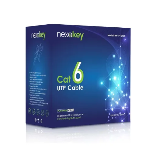 The Nexakey Platinum Series NX-PT57C6 CAT6 305 meters UTP Cable is a premium networking solution engineered for high-speed and reliable connectivity across large-scale installations. Constructed with solid bare copper conductors (23 AWG) and protected by a durable blue PVC jacket, this Nexakey CAT6 Cable ensures superior conductivity, durability, and long-term stability. Supporting data transmission speeds of up to 1 Gbps, it is ideal for modern networking environments such as offices, enterprises, and data centers. As a Fluke Test Passed cable, the Nexakey Internet Cable guarantees compliance with industry standards, minimizing signal loss and interference for consistent performance. Its 305-meter length provides extensive coverage for structured cabling projects, while the robust build makes it a dependable Nexakey UTP Cable for high-speed internet, VoIP, and bandwidth-intensive applications. Whether used for professional or enterprise setups, the Nexakey Network Cable delivers seamless connectivity and reliable performance.