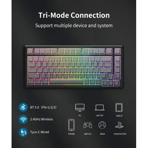 The Onikuma G83 RGB Tri-Mode Wireless Mechanical keyboard features Outemu customized switches for precision. This Onikuma Mechanical keyboard is hot-swappable for both 3-pin and 5-pin options. Tool-free customization makes this Onikuma G83 Keyboard suitable for both novices and experts. Pre-lubed linear switches provide a 45gf actuation force and 3.8mm travel. Integrated light guides improve the brightness of this Onikuma Mechanical keyboard. The 5-layer silent gasket architecture reduces typing noise by 30%. This Onikuma G83 Mechanical keyboard uses sound-absorbing foam, IXPE, and PET film. It also features a slotted PCB and a silicone pad. These layers maintain crisp tactile feedback while typing. Side-printed PBT keycaps provide a quality feel for every Onikuma Keyboard. These durable keycaps can withstand over 10 million presses. RGB backlighting on the Onikuma G83 RGB Tri-Mode Wireless Mechanical keyboard offers 16.8 million colors. Dedicated software supports music sync and macro programming for this Onikuma Keyboard. The robust 8000mAh battery provides up to 400 hours with the lighting off. USB-C charging restores full power in 3 to 5 hours. Tri-mode connectivity for the Onikuma Mechanical keyboard includes Bluetooth, 2.4GHz, and wired USB-C. This Onikuma G83 Mechanical keyboard is compatible with Windows, Mac, PlayStation, and Xbox. It is an ideal Onikuma Keyboard for gaming, streaming, and offices.