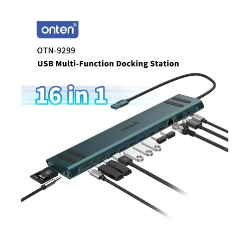 The Onten OTN-9299 16-in-1 Multi Function Docking Station is a powerful and multifuntional hub designed for modern productivity and seamless connectivity. This Onten OTN-9299 device features a reliable USB-A uplink interface for stable data transfer and broad compatibility. It includes an HDMI port supporting 1080P at 60Hz, ensuring clear and smooth video output for work or entertainment. With a high-speed RJ45 port delivering up to 1000Mbps, users can enjoy fast and stable wired internet connections. The docking station also offers a 3.5mm audio jack for convenient sound output and SD/TF 3.0 card slots for quick file access. Multiple USB ports enhance usability, including 4x USB-A 3.0 ports, 3x USB-C 3.0 ports, and 2x USB 2.0 ports for diverse device support. The 5V input ensures efficient power delivery for connected peripherals. Ideal for professionals, students, and multitaskers, the Onten OTN-9299 simplifies workspace management while boosting productivity. Whether for office setups or home use, the Onten OTN-9299 delivers reliable performance, flexible connectivity, and excellent value for users seeking an all-in-one docking solution.