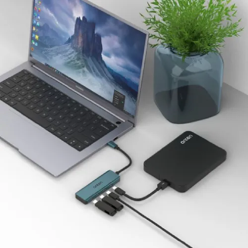 The Onten OTN-UC620 4-in-1 USB Type-C Hub is a compact and high-performance 4-in-1 USB Type-C hub designed for modern connectivity needs. This multifuntional hub features one USB Type-C male input and 4x USB Type-C female outputs, ideal for expanding device compatibility. With USB 3.2 Gen2 support, it delivers ultra-fast data transfer speeds up to 10 Gbps for efficient file sharing. The Onten OTN-UC620 ensures seamless performance when connecting multiple peripherals, including smartphones, tablets, and laptops. Its durable design and crystal teal finish provide both style and reliability for daily use. The short 0.15-meter cable enhances portability while reducing clutter on your workspace. Users benefit from stable connections and consistent performance across all four USB Type-C ports. The Onten OTN-UC620 is perfect for professionals, students, and tech enthusiasts seeking a reliable USB Type-C hub solution. Its plug-and-play functionality eliminates the need for additional drivers or software installation. Overall, this USB Type-C hub is a smart choice for anyone needing efficient multi-port expansion in a compact design.