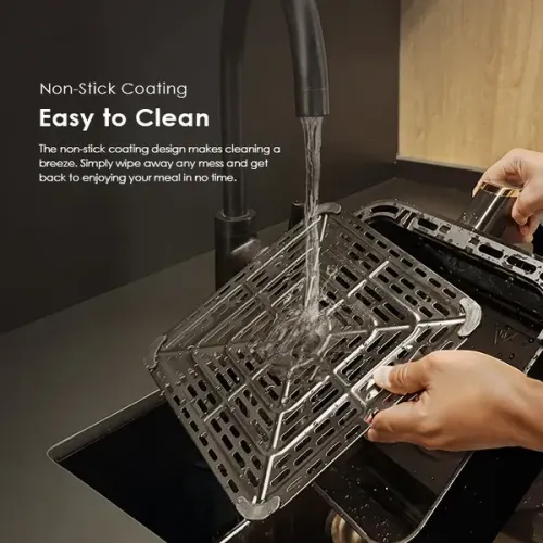 The non-stick coated grill pan allows quick and effortless cleaning after cooking. Users can easily wipe away food residue, making maintenance simple and fast. This design ensures the Oraimo OH-AF210N Air Fryer remains convenient for regular use.