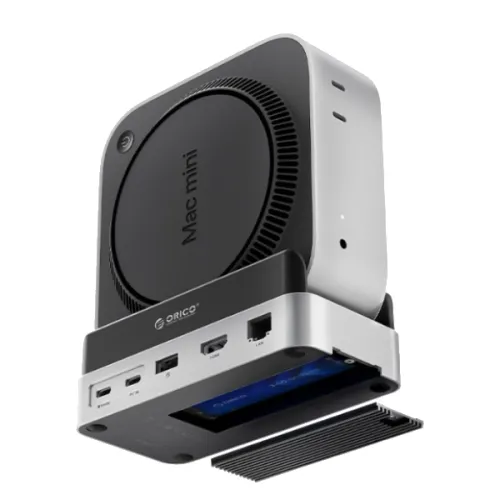 The ORICO MiniDock VSP10 is a multi-functional 10-port docking station specially designed for the Apple Mac Mini M4 2024. Offering seamless functionality for modern workflows. With a sleek aluminum, silicone, and plastic design, this Orico docking station dissipates heat quickly for dependable performance even under intensive use. It has a variety of ports for maximum connectivity, including USB-C (10Gbps), USB-A (10Gbps), two USB-A (5Gbps), an HDMI port supporting up to 4K at 60Hz, an RJ45 Ethernet port (1000Mbps), SD/TF card slots with simultaneous access, and an integrated M.2 SSD enclosure that supports both NGFF and NVMe drives up to 8TB. The built-in quality chip offers reliable and fast data transfer for demanding operations. The ORICO MiniDock VSP10 also supports up to 10Gbps transmission speeds via USB-C and USB-A connections, enabling quick and efficient file transfers. The USB-C port with PD100 can generate up to 100 watts of power, making it ideal for charging devices or powering connected peripherals. A USB-C to USB-C cable (10Gbps, 0.3m) is included for easy communication. This Hub docking station for Apple Mac Mini 2024 works with a variety of operating systems, including Windows, Linux, Mac OS, and Android, giving it a versatile solution for a wide range of device configurations. The ORICO MiniDock VSP10 10 Ports Docking Station for Mac Mini M4 2024 is designed to increase productivity by allowing users to connect several peripherals at once, making it ideal for professionals and creatives. Its HDMI connector provides clear pictures of up to 4K resolution at 60Hz, making it excellent for presentations, video editing, and extended displays. The SD/TF card slots allow photographers and content creators to easily access their files, while the Ethernet connector offers steady and fast internet connectivity.
