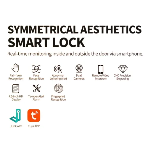 The Ovalin EDGE Smart Door Lock is a next-generation security system that combines clever technology and premium design to reinvent home and business protection. The Ovalin EDGE Smart entrance Lock, with its magnificent 4.5-inch HD display and dual cameras, enables you to have real-time video monitoring straight through your smartphone, giving you complete control and sight over who approaches your entrance. With powerful 3D facial recognition and ultra-fast fingerprint unlocking, the Ovalin EDGE Door Lock provides seamless, secure, and convenient access in a fraction of a second. It also supports a variety of unlocking methods, such as password entry, IC card, mechanical key, guest OTP, mobile app, and remote unlocking, giving every user options. What actually distinguishes the Ovalin EDGE Smart Door Lock is its use of palm vein identification, which provides biometric-level precision and an extra degree of security for your belongings. The built-in tamper alert siren and abnormal loitering detection technology give rapid notifications to your smartphone, keeping you informed of any unusual behavior near your entrance. The lock's sleek and durable body is CNC precision-engraved, blending modern aesthetics with strong construction for long-term dependability and fashionable appeal. The Ovalin EDGE Door Lock works with both the JLink and Tuya apps, allowing users to manage access, monitor activities, and open remotely from anywhere in the world. Whether you are protecting your smart home, apartment, or workplace, the Ovalin Smart Door Lock offers the ideal combination of technology and peace of mind.