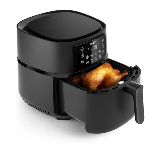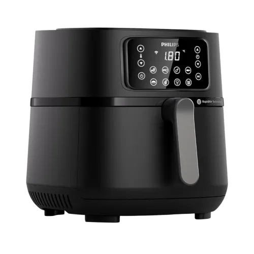The Philips 5000 Series XXL Connected Air Fryer has a big 7.2-liter capacity and can hold up to 1.4 kg of food, making it ideal for families that wish to cook large meals in a single basket without sacrificing taste or texture. This Philips Air Fryer is made of robust plastic and aluminum and includes a coolwall enclosure, heat-resistant body, non-slip feet, and cool-touch handgrips to ensure safe and steady operation during every cooking session. The Rapid Air technology distributes hot air evenly to produce crispy results with little to no extra oil, and the adjustable thermostat allows for exact temperature control up to 200°C. A digital interface with five preset programs simplifies cooking, while the built-in timer, keep warm function, and temperature indicator keep you in control at all times. What actually distinguishes the Philips 5000 Series XXL Connected 7.2L Air Fryer is its internet connectivity and remote control feature, which allows you to control cooking from your smartphone for greater flexibility. The single removable basket has a nonstick coating and is dishwasher safe, making cleanup quick and simple. Cord storage, an integrated on/off switch, automated shut-off, and a power light are all smart touches that improve everyday ease. The Philips 5000 Series XXL Connected Air Fryer is designed for efficiency and supports eco-friendly use while providing continuous performance.