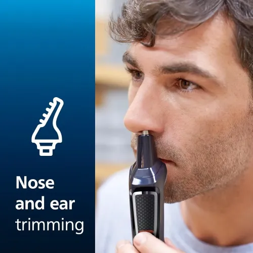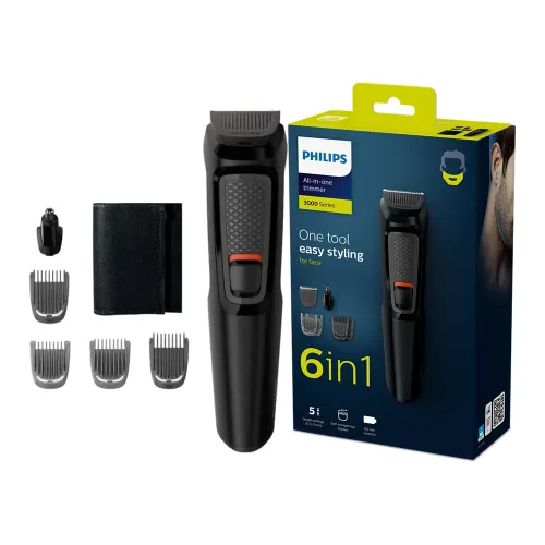 The Philips MG3710/33 Multigroom 3000 Series 6-in-1 Trimmer is a reliable face grooming tool that comes with a variety of tools for everyday styling. The Philips Trimmer has six tools that can be used to take care of all of your beard's needs. Self-sharpening steel blades work consistently and stay sharp for a long time without needing to be oiled. There is a precise trimmer and a nose and ear trimmer in the Philips Multigroom 3000 Series Trimmer. With four combs, you can trim your face and get the perfect length for your needs. There are two combs for stubble that are 1mm and 2mm wide and two combs for beards that are 3mm and 5mm wide. The Philips MG3710/33 Trimmer makes it easy to get a long beard, a short beard, or stubbled hairstyle. It also works with sharp lines, thorough styling, and clear goatee shaping. The Philips Trimmer can work without a cord for up to an hour after being fully charged. Charging takes 16 hours to get the most power and reliable performance. The device's stable and steady output is made possible by a long-lasting Ni-MH battery. Automatic voltage compatibility from 100V to 240V makes it safe to use in other countries. The Philips MG3710/33 Multigroom 3000 Series 6-in-1 Trimmer has accessories that can be rinsed clean, making it easy to keep it clean. Low energy mode uses less than 0.3W of power to help you save it. When turned off and no devices are attached, the energy use stays below 0.1W. The Philips MG3710/33 Multigroom 3000 Series Trimmer has a useful design, is built to last, and has precise style tools. This Philips Trimmer is a reliable tool for guys who want to take care of their faces in an easy and effective way.