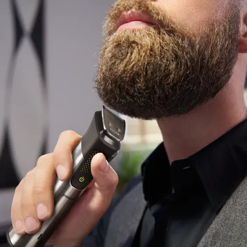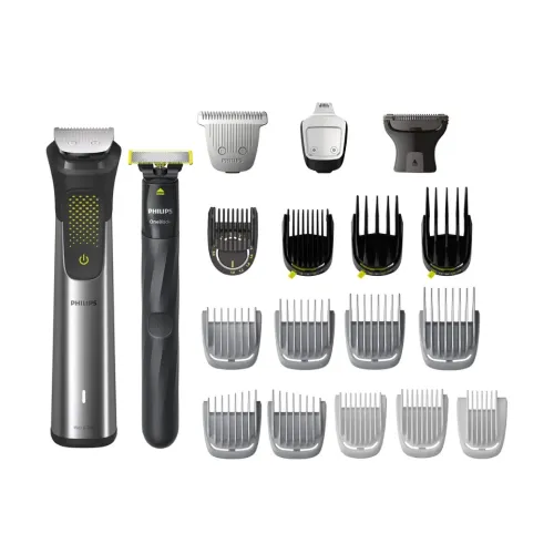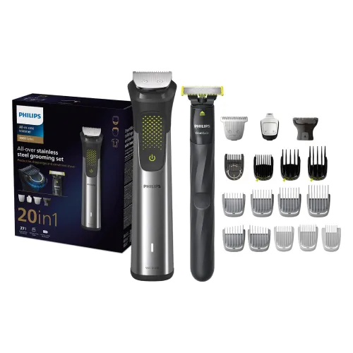 The Philips MG9553/15 9000 Series 20-in-1 Trimmer provides a complete grooming solution for your face, head, and body hair. This versatile Philips Trimmer features unique OneBlade technology to provide clean lines and sharp edges during every shave. Utilizing BeardSense technology, the Philips MG9553/15 Trimmer scans hair density 125 times per second to boost power for thick beards. You can achieve professional results with self-sharpening stainless steel blades that require no oil for long-lasting performance. This premium Philips Trimmer includes twenty high-quality attachments for precise styling across twenty-seven different length settings. A specialized precision trimming comb allows for adjustments between one and three millimeters in fine increments of zero point two millimeters. The extra-wide forty-one millimeter hair clipper facilitates thirty percent faster hair trimming compared to standard models for quick haircuts. Users will appreciate the ergonomic rubber grip which ensures maximum control while maneuvering the device in wet or dry conditions. The Philips MG9553/15 9000 Series 20-in-1 Trimmer is one hundred percent showerproof, making cleaning and maintenance incredibly simple. Powering the main unit is a robust lithium-ion battery providing one hundred twenty minutes of runtime on a single sixty-minute charge. A convenient five-minute quick charge option ensures you never run out of battery power during an important grooming session. The included OneBlade handle runs for thirty minutes and uses a dual-sided blade to protect sensitive skin while shaving. Dedicated attachments like the body shaver with skin protection and the eyebrow comb help you manage all grooming. Keep everything organized with the soft pouch and battery indicators that signal low, empty, or full status levels. This reliable Philips MG9553/15 Trimmer utilizes universal USB-A charging for modern convenience. Use this professional grooming kit.