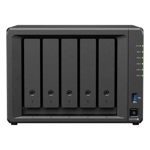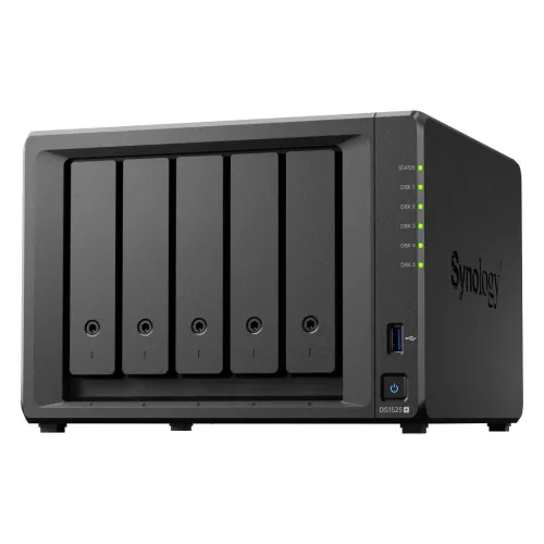 The Synology DiskStation DS1525+ 5-Bays NAS Enclosure is powered by a 2.6 GHz AMD Ryzen R1600 Dual-Core, an AES-NI hardware encryption engine, and Btrfs file system support. It is designed for small offices and IT enthusiasts. Two built-in M.2 SSD slots and Synology SSD Cache technology allow you to boost system I/O and application performance. This NAS is equipped with five drive bays that are capable of natively supporting 3.5" SATA hard drives, as well as 2.5" SATA hard drives and SSDs for data storage. The DiskStation DS1525+ easily scales up to 15 drives. Not only does it offer two 92 x 92 x 25mm fans to help keep the system running cool always, but its noise-dampening design also makes for quiet operations. The server supports numerous scheduled power on/off cycles and hard drive hibernation to further minimize power consumption and operation expenses.