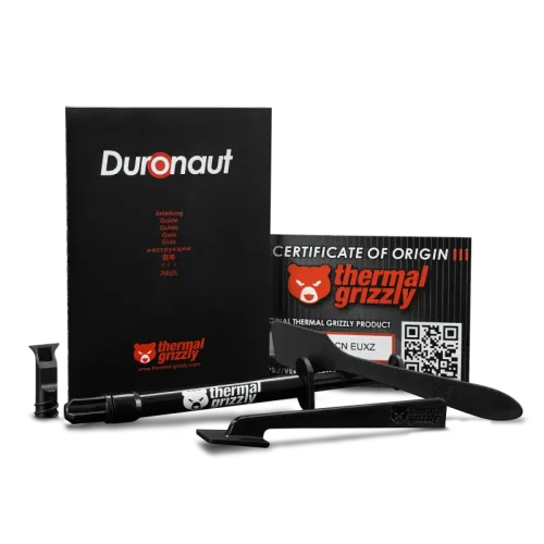 Thermal Grizzly Duronaut 2g Thermal Paste is a high-performance cooling solution designed for those who require maximum thermal conductivity and long-term stability in their systems. Its name, Duronaut, is derived from the term "durability," representing its long lifespan and ability to work consistently throughout time. This sophisticated paste is made from a specifically designed silicone oil filled with aluminum microparticles and zinc oxide nanoparticles of diverse shapes and sizes. This particular formulation not only provides excellent heat transfer but also reduces the normal pump-out effect, keeping the paste firmly in place even during heavy thermal cycling. The Thermal Grizzly Duronaut Thermal Paste has great long-term stability and is resistant to hardening, making it excellent for gaming rigs, workstations, and overclocked systems. It is electrically non-conductive, ensuring safe application without the risk of short circuits, and its optimized particle structure enables it to be applied in ultra-thin layers, reducing thermal resistance and increasing adhesion. This results in faster and more effective heat transfer from the CPU or GPU to the cooler, which improves system stability and extends hardware life. The Thermal Grizzly Duronaut Thermal Paste also includes the TG Spatula Pro, which is designed for optimal application by exerting more pressure to generate a thinner, more uniformly distributed coating of thermal paste.