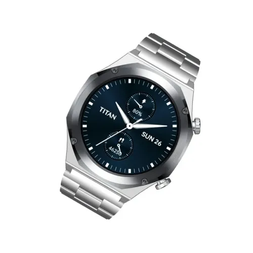 The Titan Maestro Premium Smart Watch is a sophisticated wearable that seamlessly blends classic luxury with advanced digital functionality. It is equipped with a vibrant 1.43-inch Super AMOLED display that offers a high-resolution viewing experience of 466 by 466 pixels, delivering crisp visuals and smooth transitions with a 60Hz refresh rate. With up to 650 nits of brightness, the screen remains clear and easily readable in bright sunlight, while the toughened glass ensures durability and long-term scratch resistance. The Always-On-Display feature enhances usability by allowing users to glance at time and notifications without waking the screen. Designed with a round stainless steel case, the watch measures 47mm in width, 50mm in length, and has a slim 10.5mm thickness, paired elegantly with a stainless steel strap and a secure push button clasp, giving it a polished and premium look suitable for both formal and active wear. Internally, the smartwatch houses a 350mAh battery that delivers up to 10 days of battery life on a single charge, making it ideal for extended use without frequent recharging. It supports fast charging and reaches full capacity in just around 2 hours. The Titan Maestro Smart Watch connects via Bluetooth version 5.3, offering a stable and efficient wireless experience for Bluetooth calling, AI voice assistant commands, music and camera controls, and seamless syncing with smartphones. It is compatible with both Android and iOS platforms, expanding its usability across devices. Built to withstand daily challenges, it is IP68 water resistant, making it suitable for workouts, showers, and wet weather conditions. The watch comes equipped with multiple smart sensors that monitor heart rate, blood oxygen (SpO2), sleep patterns, sports activity, and even includes guided breathe exercises, making it a comprehensive health and wellness companion. The Titan Health platform provides centralized access to all health data for easy monitoring and goal tracking. Other smart features include support for over 150 stylish and customizable watch faces, including immersive 3D options, real-time weather display, Do Not Disturb (DND) mode, adjustable sound and vibration alerts, and a crown button for easy navigation. Whether you’re managing calls on the go, checking health metrics, or customizing your style, the Titan Maestro Premium Smart Watch delivers a complete smartwatch experience wrapped in a timeless, elegant design.