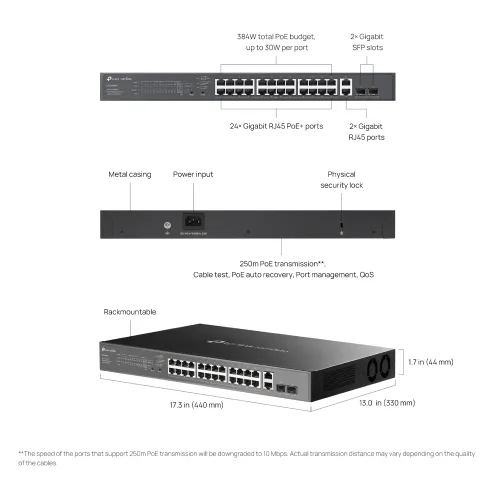 | Advanced Functions | Supports plug-and-play for instant connectivity and simple configuration for additional features Centralized Cloud Management via the web or the Omada app Up to 250m PoE, QoS, PoE Auto Recovery, and Port Isolation for reliable surveillance networking Automatic Loop Prevention, VLAN, and IGMP Snooping Durable metal casing and rack-mountable design ±6kV Surge Protection |