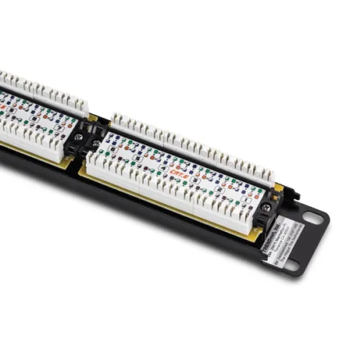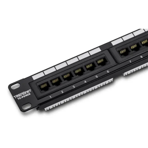 The TRENDnet TC-P24C6 24-Port Cat6 Unshielded 1U Patch Panel offers Gigabit Ethernet connections in both commercial and residential settings. This 1U rackmount patch panel has 24 connections and is Gigabit-ready, providing a constant 250 MHz signal for copper-based Ethernet networks. It is designed to suit the requirements of Ethernet, Fast Ethernet, and 1000Base-T Gigabit applications, making it an adaptable component for current data infrastructure. The TRENDnet TC-P24C6 24-Port Cat6 Unshielded 1U Patch Panel fulfills industry performance and compatibility standards, including ANSI/EIA/TIA 568-B.2-1 and ISO/IEC 11801. It has a new 110D IDC type terminal block that is compatible with both 110 and Krone type punch-down tools. It also works perfectly with TRENDnet's TC-PDT Punch Down Tool for fast and accurate installation. The TRENDnet TC-P24C6 24-Port Cat6 Unshielded 1U Patch Panel's 180-degree horizontal arrangement allows for efficient cable routing in conventional 19-inch rack systems, and color-coded labeling makes it simple to follow T568A or T568B wiring schemes, reducing installation errors. This TRENDnet Patch Panel is also backward compatible with Cat 3, 4, 5, and 5e cabling, providing versatility in mixed-cable settings. The TRENDnet TC-P24C6 24-Port Patch Panel's unshielded design makes it a low-cost solution for installations where EMI protection is not a necessity, while still providing solid performance for Gigabit data transfer. The UL E157358 designation further ensures product safety and quality.