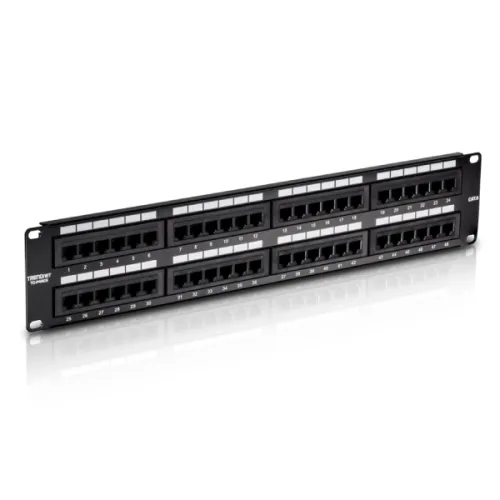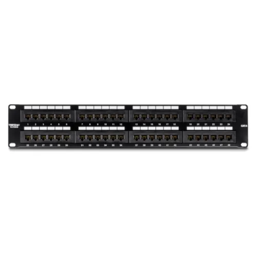 The TRENDnet TC-P48C6 48-Port Cat6 Unshielded 1U Patch Panel offers Gigabit Ethernet connections in both commercial and residential settings. This 1U rackmount patch panel has 48 connections and is Gigabit-ready, providing a constant 250 MHz signal for copper-based Ethernet networks. It is designed to suit the requirements of Ethernet, Fast Ethernet, and 1000Base-T Gigabit applications, making it an adaptable component for current data infrastructure. The TRENDnet TC-P48C6 48-Port Cat6 Unshielded 1U Patch Panel fulfills industry performance and compatibility standards, including ANSI/EIA/TIA 568-B.2-1 and ISO/IEC 11801. It has a new 110D IDC type terminal block that is compatible with both 110 and Krone type punch-down tools. It also works perfectly with TRENDnet's TC-PDT Punch Down Tool for fast and accurate installation. The TRENDnet TC-P48C6 48-Port Cat6 Unshielded 1U Patch Panel's 180-degree horizontal arrangement allows for efficient cable routing in conventional 19-inch rack systems, and color-coded labeling makes it simple to follow T568A or T568B wiring schemes, reducing installation errors. This TRENDnet Patch Panel is also backward compatible with Cat 3, 4, 5, and 5e cabling, providing versatility in mixed-cable settings. The TRENDnet TC-P48C6 48-Port Patch Panel's unshielded design makes it a low-cost solution for installations where EMI protection is not a necessity, while still providing solid performance for Gigabit data transfer. The UL E157358 designation further ensures product safety and quality.