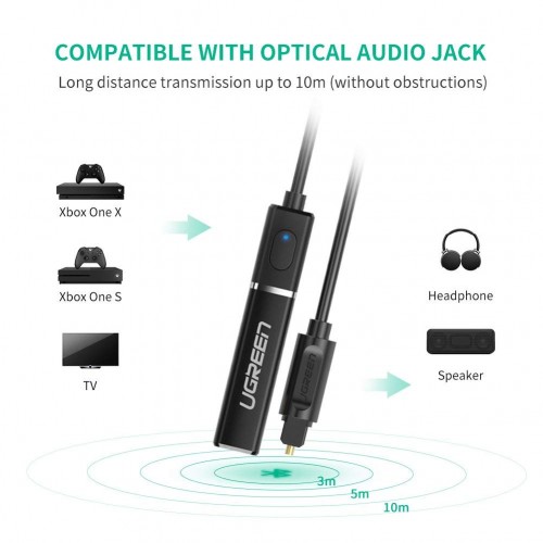 UGreen 50213 Bluetooth 4.2 Receiver (with wide compatibility) Audio Adapter easily adds Bluetooth function to your TV/PC, creates wireless connection and transmit audio between your PC/TV and Bluetooth speakers/headsets/amp. Enjoy wireless music freely in perfectly synced high-fidelity auditory feast. The internal DSP can automatically coordinate audio transmission to provide more stable audio signal transmission. Ideal for using in exercising, watching late night TV shows but not disturbing others.Plug and play, no driver is needed. Easy to pair and auto-reconnects to the last 2 paired devices. Note: It supports stereo sound, NOT support Dolby and DTS Surround sound. The sampling rate should be less than 48K/16BIT.Enjoy Impeccable HiFi Audio: Compared with 4.1 Bluetooth transmitter, the Bluetooth 4.2 aux adapter features aptX low latency technology and AAC / SBC codes, freely to immerse yourself in clear HiFi audio sound without sync delay. The transmission distance of one headset can reach up to 33ft/10m and distance between two headsets up to 16ft/5m in unobstructed effective range. Please kindly make sure there is No barrier between the transmitter and device or 2.4G device stays too close to interface.Please make sure your TV/PC with Optical port before purchase.There is NO built-in battery, 5V power supply is required.USAGE Step: First, connect the transmitter to TV/PC optical port and charge it by the micro usb cable;Then, turn on your bluetooth headphone/speaker and place it near the transmitter;Third, pair your bluetooth device with the transmitter. Our transmitter support support APTX LL, less than 50mS. Audio Lag is related with both the bluetooth devices and transmitter.
