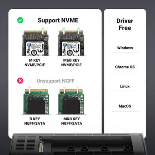 Others | Compatible Protocol: NVME 1.3 Compatible Size: 2230/2242/2260/2280 Connector Type: M-Key & M+B Key USB Cable: USBC-C Aluminum alloy enclosure with built-in heat dissipation Tool-free installation SMART function, SSD status monitoring, and data protection |