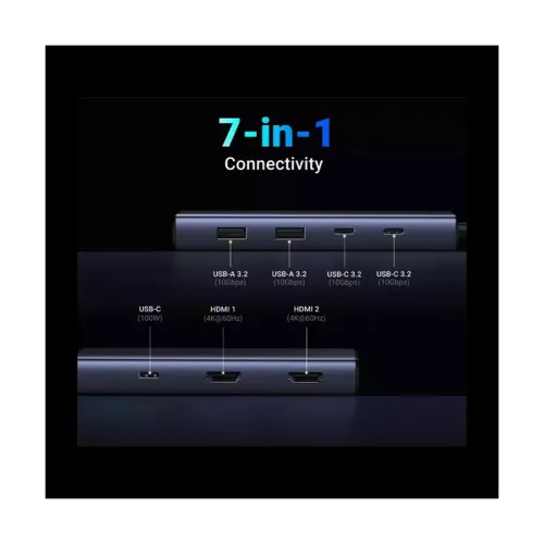 The Ugreen CM498 7-in-1 Type-C Multifunction Hub is a powerful connection solution that aims to increase productivity and simplify your digital life. The Ugreen CM498 Hub #45379 has a USB 3.2 Type-C male input and offers a variety of output interfaces, including 2x USB-A 3.2 ports, 2x USB-C 3.2 ports, 2x HDMI connections, and a PD charging connector that supports up to 100W Power Delivery for ultra-fast device charging. With a data transmission speed of up to 10Gbps, the Ugreen CM498 7-in-1 Multifunction Hub enables you to transfer huge files, stream 4K films, and easily connect numerous devices. Dual HDMI outputs enable 4K (3840 × 2160) quality, providing superb graphics for professional displays, gaming, and home entertainment. The Ugreen CM498 Multifunction Hub #45379 is compatible with both Windows and macOS and has plug-and-play capability, so no additional drivers or setup are required. Built with USB 3.2 technology, it ensures a robust network connection, dependable performance, and increased productivity. The Ugreen CM498 7-in-1 Type-C Multifunction Hub's tiny and lightweight design makes it ideal for professionals on the road, combining ease and versatility in a single stylish gadget.