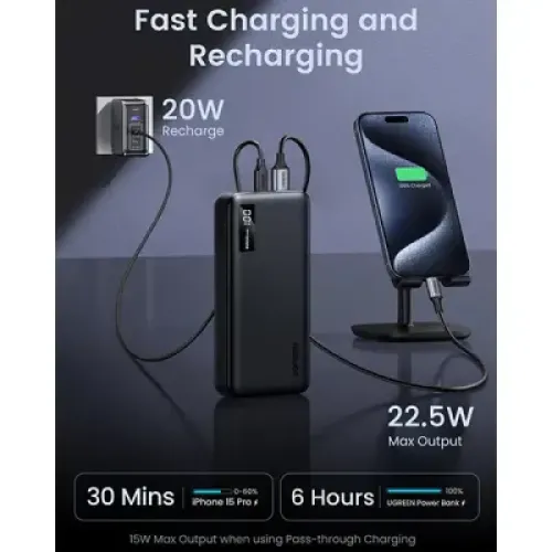 The UGREEN PB312 (25683) 20000mAh 20W Fast Charging Power Bank is a versatile and high-capacity charging solution designed for users who need reliable power on the move. With a 20000mAh battery, it can recharge devices multiple times, making it ideal for travel, work, and outdoor use. The power bank supports two-way fast charging through a USB-C port that delivers up to 20W output and accepts 20W input, allowing both your devices and the power bank itself to recharge quickly. It also includes two USB-A ports with a maximum output of 22.5W each, enabling you to charge three devices simultaneously with a combined output of 15W. The UGREEN PB312 digital LED display provides clear battery status updates, while the low-current mode ensures safe charging for smaller devices like earbuds and fitness trackers. Safety features are built-in, including protection against over-voltage, over-current, over-charge, over-discharge, overheating, and short circuits. The UGREEN PB312 20W Fast Charging Power Bank is airplane-approved and compact, making it easy to carry in a bag or pocket. It comes with a USB-C to USB-A cable for added convenience and meets international safety standards such as UL certification and IEC 62133 compliance. Whether you're commuting, traveling, or working remotely, the UGREEN PB312 20000mAh Power Bank offers fast, safe, and efficient charging with universal compatibility and a user-friendly design. It's a dependable companion for anyone who needs consistent power throughout the day.