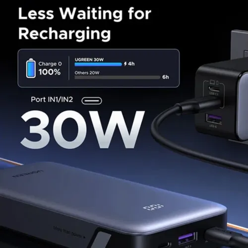 The Ugreen PB532 20000mAh 30W Power Bank is a reliable portable charger built for consumers that want consistent power while on the road. With a gigantic 20000mAh capacity, the Ugreen PB532 20000mAh Power Bank extends battery life for smartphones, tablets, laptops, and other USB-powered devices. With twin USB-C and USB-A ports, the Ugreen PB532 Power Bank supports a variety of fast-charging protocols, including UFCS (up to 33W), PD3.0/PD2.0, QC3.0/QC2.0, SCP, FCP, AFC, Apple 5V2.4A, and DCP, assuring broad compatibility. The USB-C interface enables 5V/3A, 9V/3A, and 12V/2.5A charging at up to 30W, allowing for a rapid recharging of the power bank. The USB-A output gives up to 22.5W (SCP) and supports UFCS at 33W, whilst the USB-C output provides up to 30W with PPS support (5-11V/3A) for fast device charging. The Ugreen PB532 20000mAh Power Bank is 15×7×3 cm and weighs only 447g, making it ideal for travel or daily usage. With a dedicated power button and broad compatibility, the Ugreen PB532 20000mAh 30W Power Bank is an excellent choice for anybody looking for a dependable, high-speed charging solution.