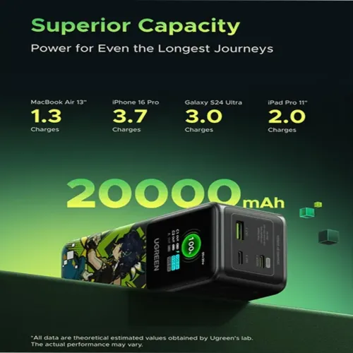 The Ugreen PB721 Genshin Impact Edition Power Bank is a stylish, powerful portable charger with sophisticated fast-charging technology. The special model has a 130W rapid charging output and a 20,000mAh battery capacity (4 × 5000mAh BAK 21700 lithium-ion cells, 72Wh), making it suitable for powering laptops, tablets, cellphones, and game consoles. The Ugreen PB721 Genshin Impact Edition 20000mAh Power Bank has a sturdy construction that allows for up to 800 charge cycles, ensuring long-lasting performance. It is equipped with three versatile outputs (USB-C1, USB-C2, and USB-A), delivering up to 100W from USB-C1, 30W from USB-C2, and 22.5W from USB-A, while supporting a wide range of protocols such as PD3.0, PPS, QC3.0/2.0, SCP, FCP, AFC, and Apple 5V/2.4A. The Ugreen PB721 GI 20000mAh Power Bank features a TFT display for real-time monitoring and multiple smart protection systems, including NTC temperature control, auto-shutdown for low current, and a fire-resistant PC+ABS shell with V-0 flame rating. Despite its high capacity, it recharges fully in just 2 hours with a 65W PD charger, achieving an impressive ≥85% charging and discharging efficiency. Designed for safe use between 0°C to 40°C, the Ugreen PB721 Genshin Impact Edition 20000mAh Power Bank comes bundled with a 0.5m 5A USB-C to C cable, making it the ultimate power solution for gamers, travelers, and professionals who need reliable and stylish backup power on the go.