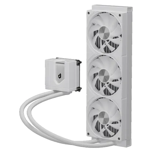 The upHere E360TC ARGB 360mm AIO Liquid CPU Cooler is ideal solution for gamers, PC builders, and overclockers looking for both functionality and style. This upHere E360TC CPU Cooler has a magnetic pump cover and supports a wide range of sockets, including Intel LGA 1851, 1700, 1200, 1150, 1155, and 1156, as well as AMD AM5 and AM4 platforms, assuring broad compatibility with current CPUs. The pump operates at 12V DC with a low minimum starting voltage of 4.5V, a maximum current of 0.35A, and a power consumption of only 4.2W, making the upHere E360TC ARGB 360mm AIO Liquid CPU Cooler an energy-efficient choice. The pump has a speed range of 800 to 2500 RPM (±10%), a maximum lift of 1.5 meters, and a minimum flow rate of 1300 mL per minute, ensuring efficient thermal transfer and system stability. The noise level remains at or below 30 decibels, ensuring silent operation. ARGB lighting adds visual impact, with a power output of 3.25W and an LED current of 0.65A. The radiator is made of aluminum for durability and heat dissipation efficiency. The upHere E360TC ARGB 360mm CPU Cooler features U3KC1800-3 black ARGB fans that operate at 600 to 1800 RPM ±10%, producing a maximum airflow of 71 CFM and an air pressure of 2.67mm/H2O. The fans use a hydraulic bearing for reliable, low-noise operation, producing no more than 27 dB(A). Each fan draws 12VDC @ 0.16A and consumes 1.9W. It connects to the CPU FAN and a 3-pin +5V-D-G header for synchronized ARGB control. With a fan MTTF of 40,000 hours and a pump lifespan of 30,000 hours, the upHere E360TC ARGB 360mm AIO Liquid CPU Cooler provides long-term reliability. This cooler, designed for extreme 300W TDP cooling and enhanced with dynamic ARGB lighting, combines performance, efficiency, and style into a single, streamlined solution.