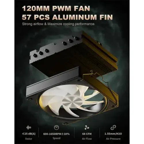 The upHere H85KC6 ARGB 120mm Air CPU Cooler is a powerful cooling solution built for high-performance PC systems. Designed with a durable aluminum and copper coldplate measuring 40 x 35 mm, it ensures fast and direct heat transfer from the CPU surface. The cooler features a high-quality aluminum heatsink, allowing for efficient heat dissipation during extended workloads. With six advanced copper heatpipes, it offers enhanced thermal conductivity and supports up to 180W TDP, making it ideal for gaming, rendering, or overclocking. The cooling system is a premium 120mm U3KC1 Black ARGB fan, engineered for quiet yet effective airflow. The fan operates at speeds between 600 to 1650 RPM (±10%), delivering a strong 68 CFM of airflow and a maximum air pressure of 1.55mm/H2O. Even at peak performance, it maintains a low noise output of ≤26 dB(A) for a quiet computing experience. The hydraulic bearing system enhances fan longevity with an impressive MTTF of 40,000 hours, while keeping rotation smooth and stable. Power efficiency is maintained with a 12VDC, 0.16A, 1.9W draw, ideal for energy-conscious setups.The fan includes vibrant ARGB lighting that brings your build to life with dynamic color effects. It connects easily using a CPU FAN and 3-pin (+5V-D-G) ARGB connector, allowing full synchronization with most motherboard lighting systems. Whether you want a subtle glow or a bold RGB showcase, the upHere H85KC6 delivers customizable lighting that enhances your case aesthetics.The upHere H85KC6 ARGB 120mm CPU Cooler supports a wide range of mainstream platforms. For Intel, it’s compatible with sockets 1851, 1700, 115x, 1200, 2011, 2066, and 1366. For AMD, it fits AM5, AM4, AM3, AM3+, AM2, AM2+, FM2, and FM1 sockets. This wide compatibility makes it a versatile choice for both new builds and upgrades.With its combination of strong cooling performance, whisper-quiet operation, and stunning ARGB design, the upHere H85KC6 120mm Air CPU Cooler is the perfect addition to any gaming PC or professional workstation. If you’re looking for an air cooler that balances thermal efficiency, style, and compatibility, the upHere H85KC6 ARGB CPU Cooler is a top-tier solution you can trust.