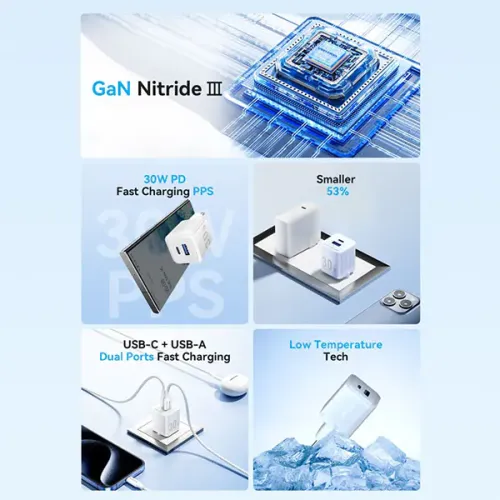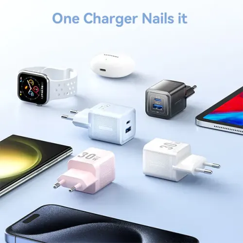 | Power Supply | Input: 100-240V~50/60Hz,0.8A Output (USB-C): 5.0V-3.0A (15.0W); 9.0V-3.0A (27.0W); 12.0V-2.5A (30.0W); 15.0V-2.0A (30.0W); 20.0V 1.5A (30.0W) (PPS): 3.3V-11.0V-3.0A (30.0W Max) Output (USB-A): 5.0V 3.0A (15.0W); 9.0V-3.0A (27.0W); 12.0V-2.5A (30.0W); 20.0V-1.5A (30.0W Max) Total Output: 5.0V-3.0A (15.0W) Protocols (USB-C): PPS/PD 3.0/QC 3.0/FCP/AFC/Apple 2.4A Protocols (USB): QC 3.0/FCP/SCP/AFC/Apple 2.4A |