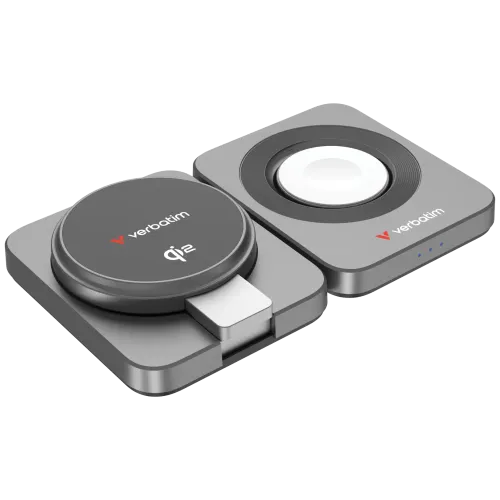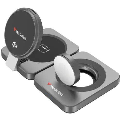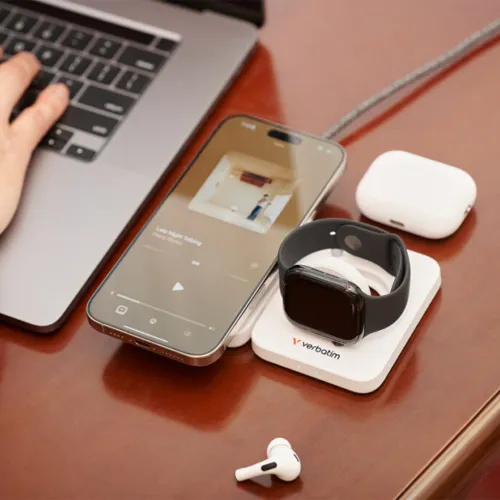 The Verbatim WCDQi201 15W Wireless Charger Adapter is a versatile and high-performance charging solution designed to keep all your devices powered efficiently. This Verbatim WCDQi201 15W Wireless Charger supports USB-C PD 3.0 input at 5V⎓3A or 9V⎓3A, delivering a maximum input power of 27W, and features MagSafe magnetic wireless charging up to 15W, fully compatible with iPhone and Qi2 devices. The Verbatim WCDQi201 Wireless Charger Adapter can charge up to three devices simultaneously, including Apple Watches at 2.5W, AirPods or other wireless earbuds at 5W, with a total maximum output of 22.5W. Its wireless charging base also provides 5W for standard Qi devices. Built with flame-resistant PC and zinc alloy, the charger is durable, heat-resistant, and lightweight at 195 g, with compact dimensions of 90.4 x 74.7 x 36 mm, available in elegant grey and white finishes. The Verbatim WCDQi201 prioritizes safety with multiple protection features, including FOD protection, over-voltage, under-voltage, over-current, short-circuit, and over-temperature protection, ensuring reliable and secure charging for all your devices.