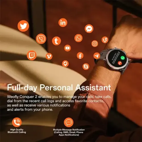 The Weofly Conquer 2 AMOLED Bluetooth Calling Smart Watch is built for outdoor sports and adventure enthusiasts. It combines durability, advanced technology, and stylish design in one powerful device. With its 1.43-inch AMOLED bright AOD display, the Weofly Conquer 2 delivers crystal-clear visuals even under direct sunlight. The screen offers 466x466px resolution, 1000 nit brightness, and a smooth 60Hz refresh rate. Protected by Asahi high-hardness glass, it ensures toughness against scratches and impacts. The Weofly Conquer 2 is lightweight at just 66g with band, making it comfortable for long wear. Designed with stainless steel and PC material, it balances strength and elegance. Whether hiking, cycling, or exploring, the Weofly Conquer 2 is your reliable companion.