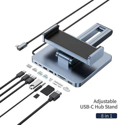 This WiWU AH801 tablet stand features an advanced 8‑in‑1 hub that boosts productivity and expands device usage. It includes a 4K 60Hz HD port, two USB 3.0 ports, one USB‑C data port, SD and TF card slots with 3.0 speed, a 3.5mm audio jack, and PD charging support. These interfaces help users connect monitors, keyboards, storage drives, audio devices, and chargers easily, useful tool for creative work, office tasks, and entertainment setups.