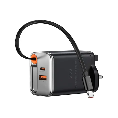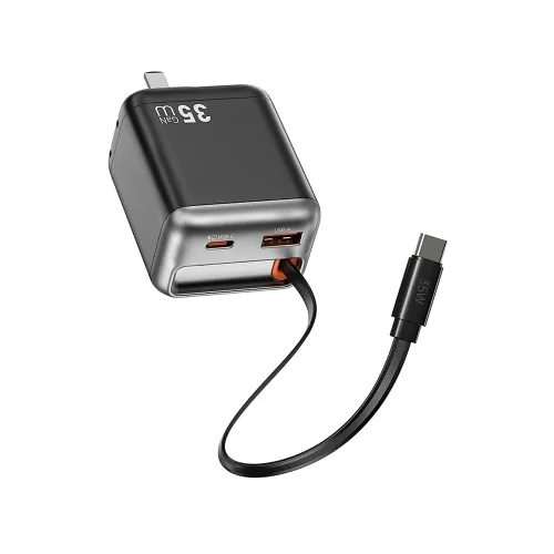 The WiWU Helix Wi‑G029 35W Dual Port GaN Charger with Built‑in Type‑C Cable is a compact and efficient charging solution that combines advanced GaN technology with portability and convenience. Made from durable PC V‑0 material with metallic paint, this WiWU 35W GaN Charger delivers up to 35W total output, ensuring fast and reliable charging for smartphones, tablets, and other devices. It features a retractable Type‑C cable alongside USB‑C and USB‑A ports, supporting multiple fast‑charging protocols such as PD3.0, QC3.0, FCP, and AFC, making it versatile for different gadgets. With flexible output combinations, the WiWU GaN Charger allows simultaneous charging while maintaining safe low‑temperature operation. Compact in size, lightweight, and equipped with global voltage input (100–240V), this WiWU Charger with Built‑in Cable is ideal for travel and everyday use. Combining efficiency, safety, and universal compatibility, the WiWU Helix Wi‑G029 Dual Port GaN Charger is the perfect choice for users seeking a reliable WiWU adapter with Type‑C Cable for fast and convenient charging.