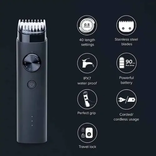 The Xiaomi Mi IPX7 Beard Trimmer is designed with 40 adjustable length settings for customizable styling. The Xiaomi Mi Trimmer's 0.5 mm precision stages allow for precise control when trimming beards of varying lengths. You can choose between short stubble and fuller beards thanks to the trimming range that goes from 0.5 mm to 20 mm. The Xiaomi Mi IPX7 Trimmer caters to a wide range of personal grooming needs with its two beard comb attachments. With a wider cutting breadth of 30 mm, you can cover more ground with each stroke, increasing your efficiency. The continuous sharpness and long-term durability of stainless steel blades make them ideal for cutting tasks. In order to make close trimming sessions more comfortable, it is recommended to use teeth that do not scratch the skin. A strong 800mAh Li-ion battery ensures reliable cordless operation of the Xiaomi Mi IPX7 Waterproof Beard Trimmer. The Xiaomi Mi Trimmer can run for up to 90 minutes on a single charge, which only takes 2 hours. The Xiaomi Mi IPX7 Trimmer also has a chord option, so users can easily use it while they're on the go. The safe operation during overseas travel is guaranteed by its worldwide voltage compatibility of 100-240V. Having washable attachments makes cleaning a breeze, which is great for keeping things clean after each usage. Along with the Xiaomi Mi Trimmer, you'll get the following necessities: an adapter-free charging cord, two combs, a cleaning brush, a carrying case, and an instruction booklet.