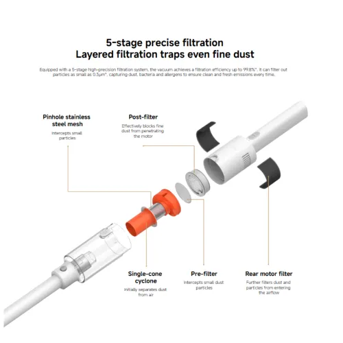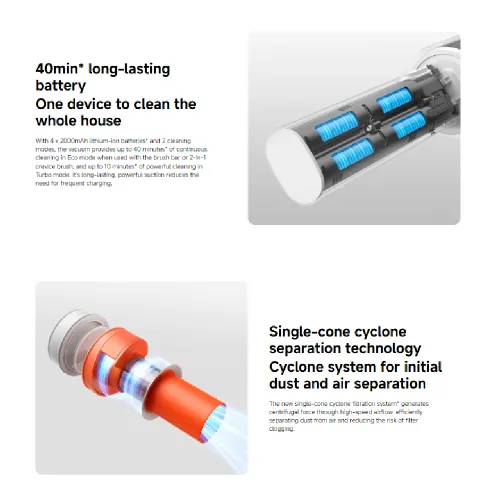| Others | 5-stage precise filtration Two brush head configurations 40min* long-lasting battery Removable accessories 110,000rpm High-speed motor Single-cone cyclone separation technology 2-in-1 crevice brush Features a Type-C charging port |