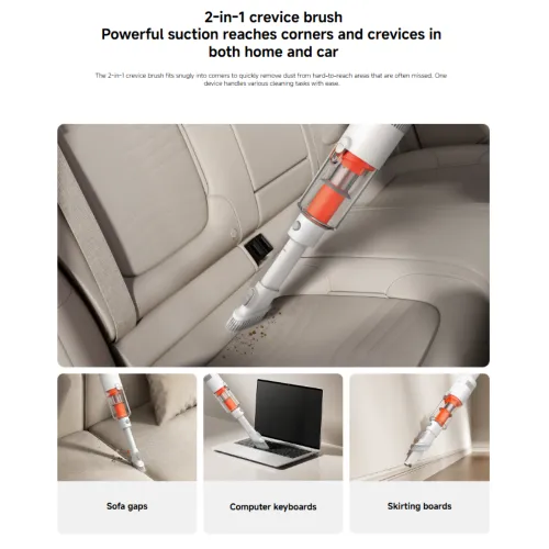 The Xiaomi P30 Vacuum Cleaner includes detachable accessories for flexible usage and compact storage. The 2-in-1 crevice brush tackles hard-to-reach areas in both home and car. Its 200mL dust compartment reduces emptying frequency, while the washable filter supports sustainable use. The Xiaomi P30 Vacuum Cleaner features a Type-C charging port for convenience and a smart button system for effortless control. Users can switch between Eco and Turbo modes with a single press. The oval handle design enhances comfort, reducing strain during prolonged cleaning. With thoughtful details and adaptable accessories, the Xiaomi P30 Vacuum Cleaner delivers efficient, powerful, and user-friendly cleaning solutions for modern living.